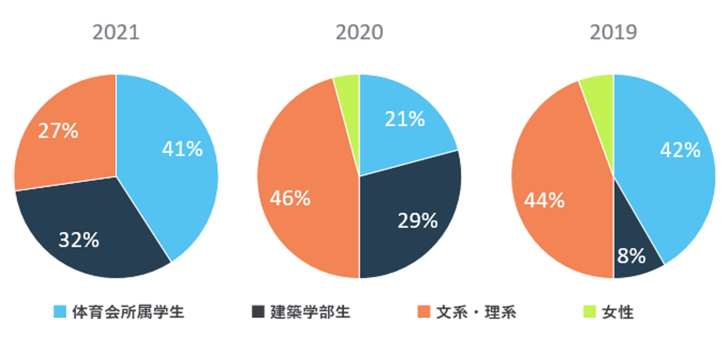 水色の「体育会学生」は先輩からの紹介などで入社してもらっていたり、部活動での経験が生きてくる仕事だと思い入社を決めていただいているケースが多いです。オレンジの「文系・理系」はマイナビなどで建設業や不動産、ものづくりに興味を持っていて技術職にチャレンジしてみたいと決めてくれています。緑の「女性」はまだまだ少ないのですが毎年30名のうち2~5名ほど入社していただいています。