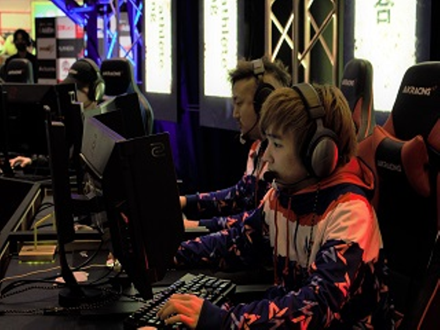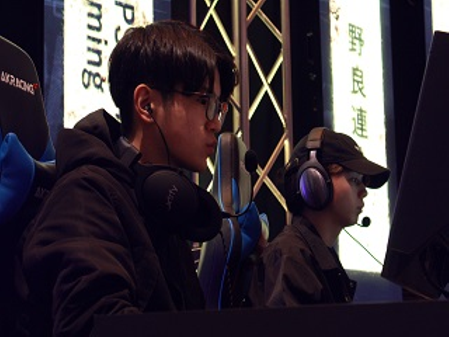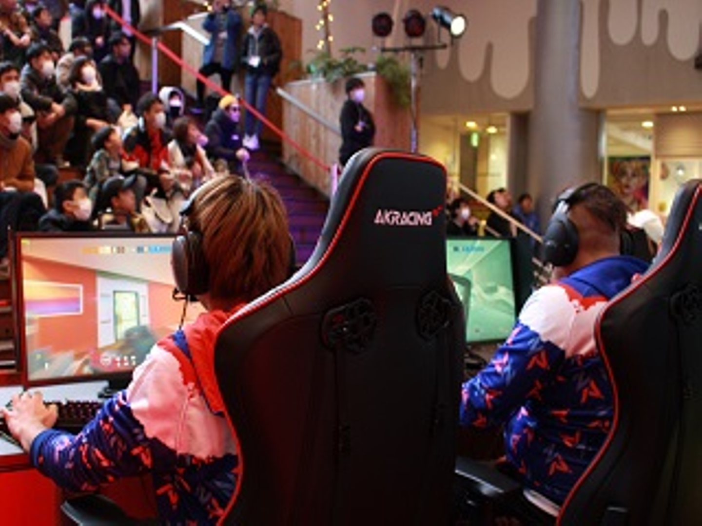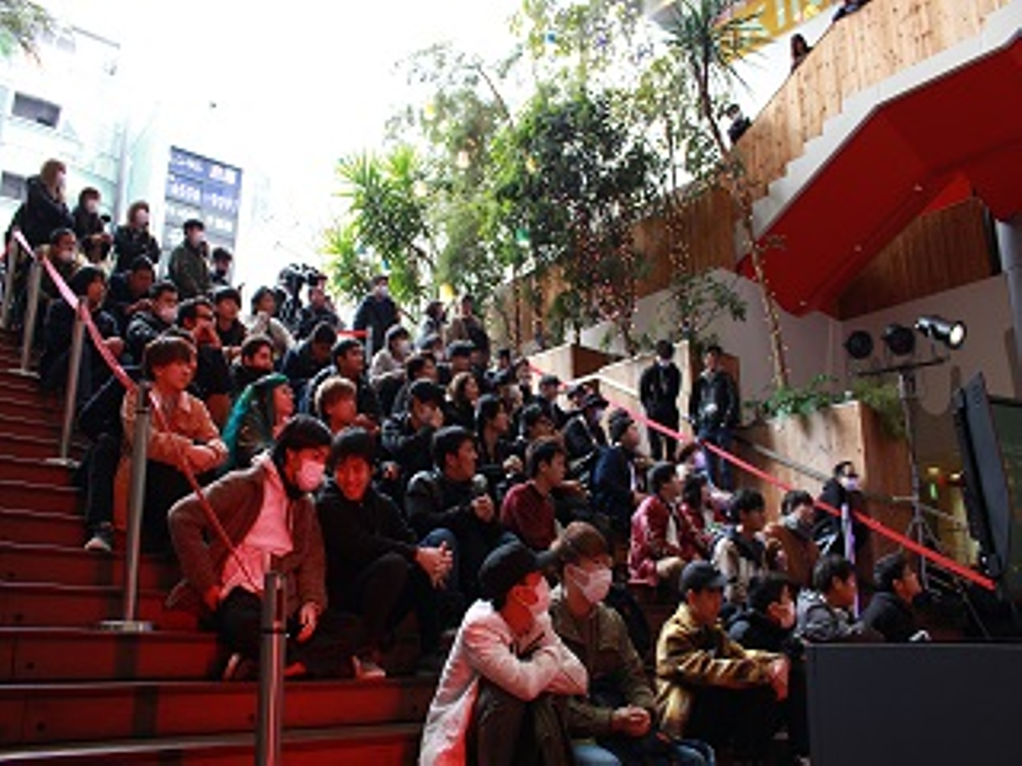対戦中も寒く、選手の方達はカイロで手を温めながらコントローラーを触っていました。多くの方が階段に座り、時には階段上で足を止め、大モニターに釘付けとなっていました。