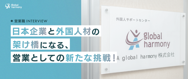 私たちA global harmony(エーグローバルハーモニー)は、 外国人に完全特化した人材会社です。嵐のように激動する現代の国際化した世界をグローバル人材で 1つに融和させ、仕事愛・人間愛で、企業側も従業員側も、 皆が幸せになる社会を目指しています。前回の記事では、A global harmonyという会社の全体像やカルチャーについてお伝えしました。第2回となる今回は、ビジネスの最前線で会社を牽引する「営業職」のメンバーにフォーカスします。「多様なメンバーの個性を、どうすればクライアントへの価値提供につなげられるだろう?」「言葉や文化の壁を越えて、チームの一体感をどう生み出すのか?...