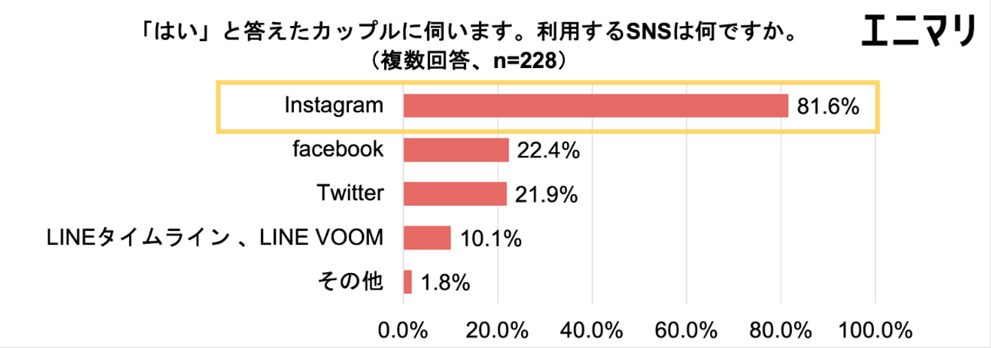 結婚報告についてたずねたところ、7割超のカップルがSNSで結婚報告をすることがわかりました。そのうちインスタグラムを利用して報告をするカップルは81.6%で圧倒的に多く、次いでフェイスブック22.4%、ツイッター21.9%が続きました。インスタグラムはSNSの中でも写真の投稿や閲覧に特化しているため、結婚報告で利用するカップルが多い模様です。