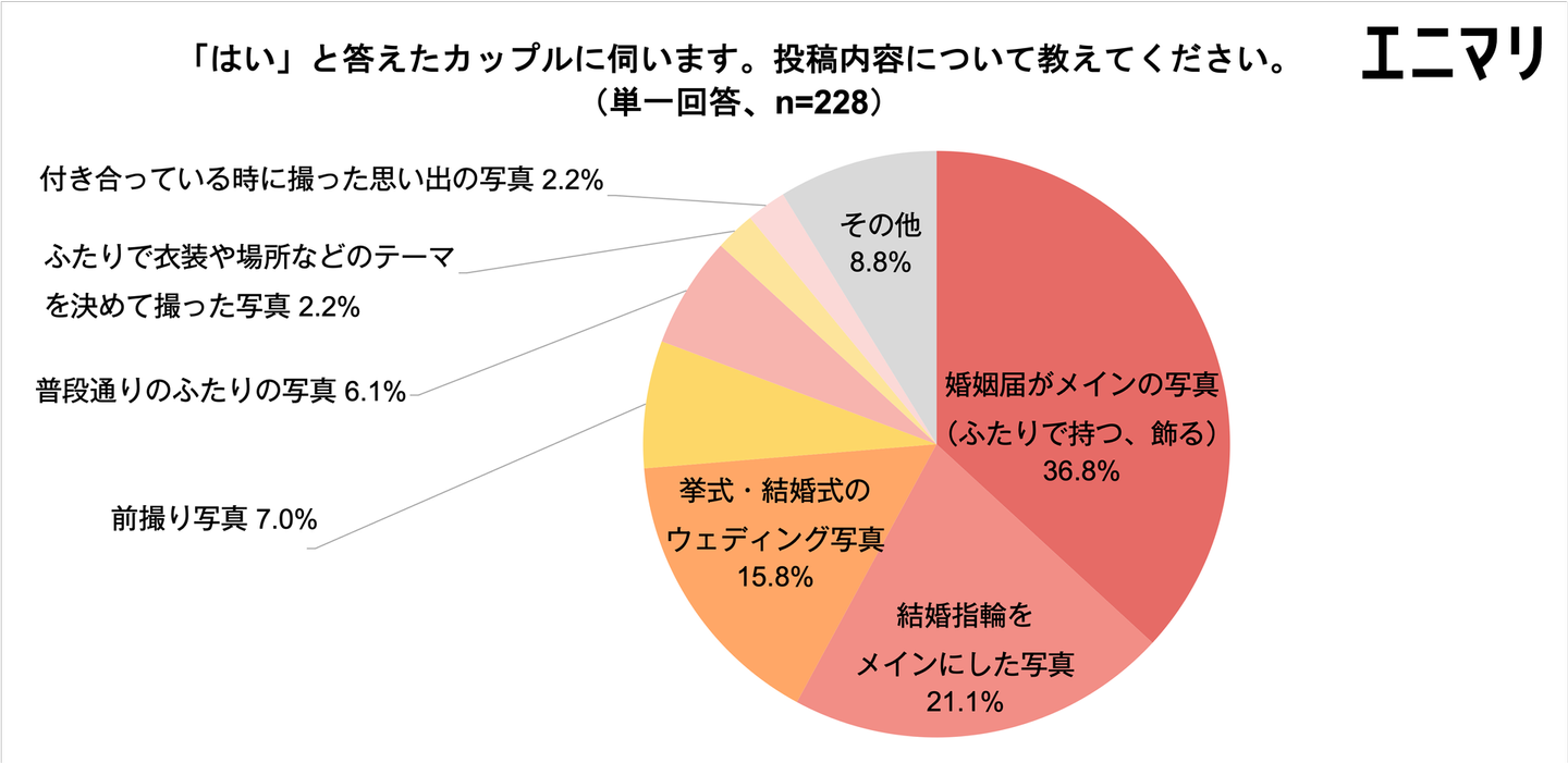 SNSで結婚報告をするカップルに投稿内容について聞いたところ、第1位が「婚姻届がメインの写真(ふたりでも持つ、飾るなど)」36.8%、第2位が「結婚指輪をメインにした写真」21.1%となり、入籍日や夫婦になった証を表現するような写真を選択するカップルが多いようです。第3位以降は「挙式・結婚式のウェディング写真」15.8%、「前撮り写真」7.0%、「普段通りのふたりの写真」6.1%などが続きました。