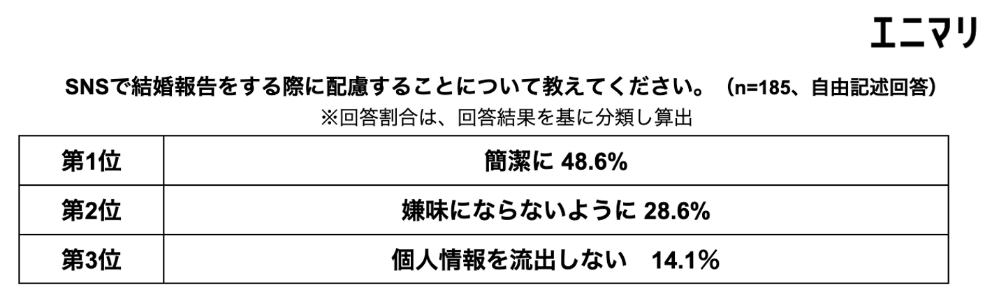 SNSで結婚報告をするカップルに、投稿の際に配慮することについてたずねたところ、シンプルに報告すべき内容のみに留めるなど「簡潔に」48.6%が最も多く、次いで、のろけ過ぎない、幸せアピールをし過ぎないなど「嫌味にならないように」28.6%、婚姻届の個人情報をぼかす、個人を特定できる画像は載せないなど「個人情報を流出しない」14.1%が続きました。