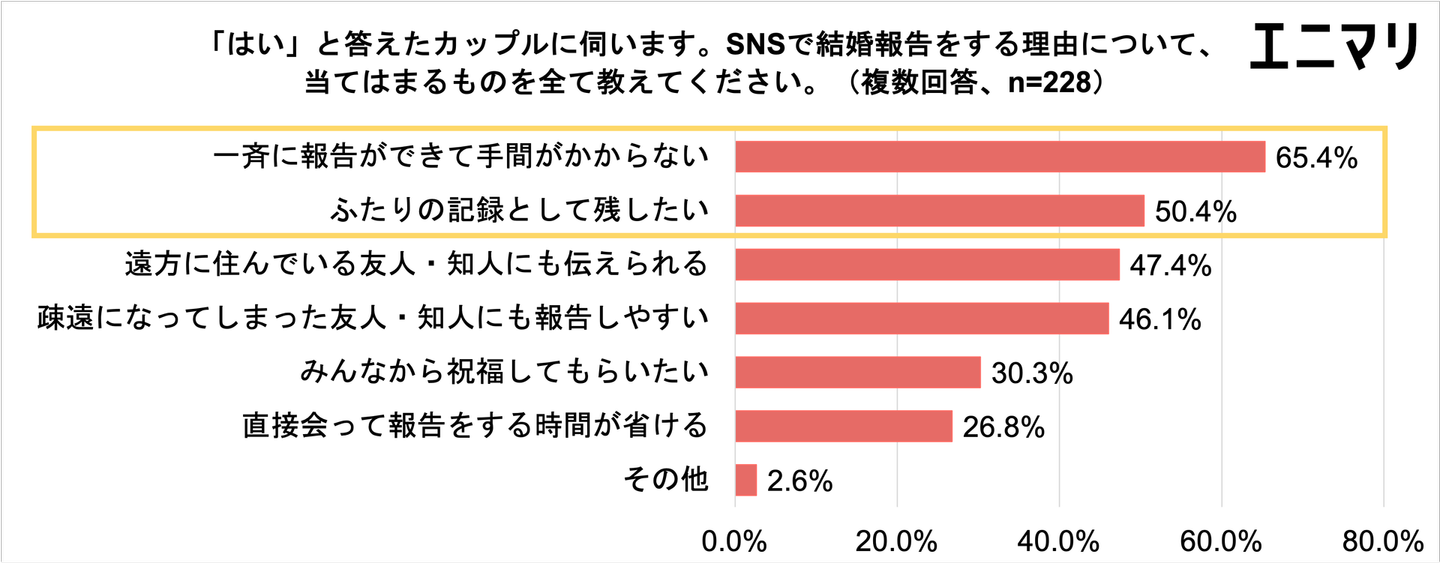 続いて、SNSで結婚報告をするカップルに理由についてたずねたところ、第1位が「一斉に報告ができて手間がかからない」65.4%、第2位が「ふたりの記録として残したい」50.4%となりました。