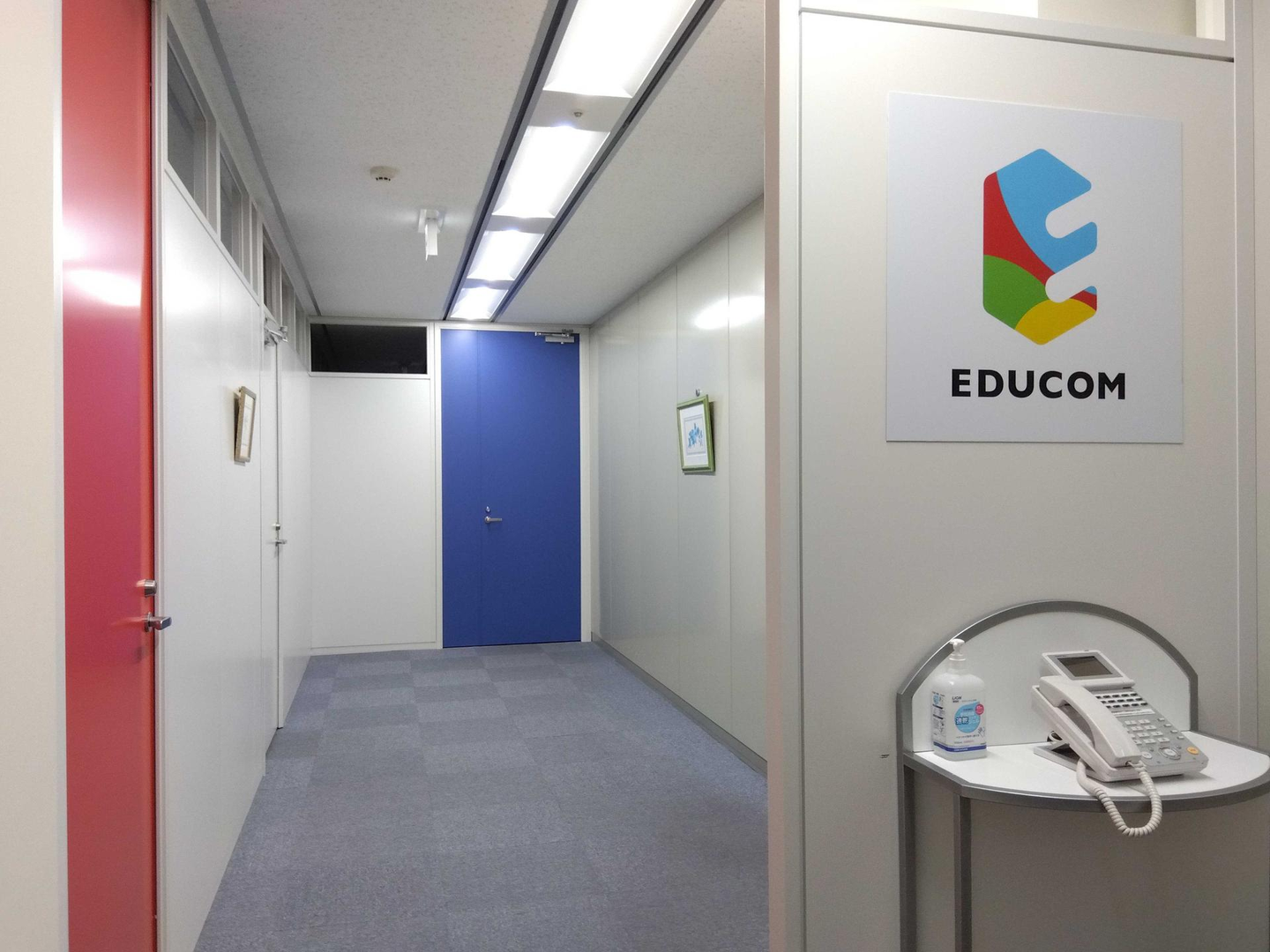 2階にあがると、EDUCOMのロゴが飾られているエントランスに到着します。エントランスのお電話をかけていただければ、スタッフがお迎えに上がります。