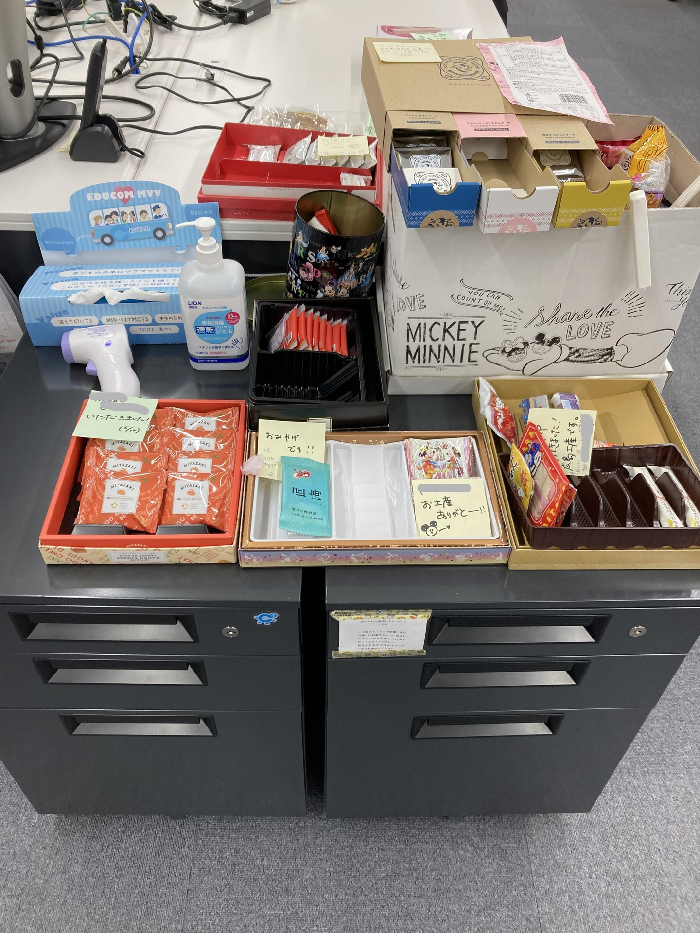 スタッフがそれぞれ買ってきたお土産を置いておくお菓子スペースも。「時には一息」つきながら業務に取り組んでいます。