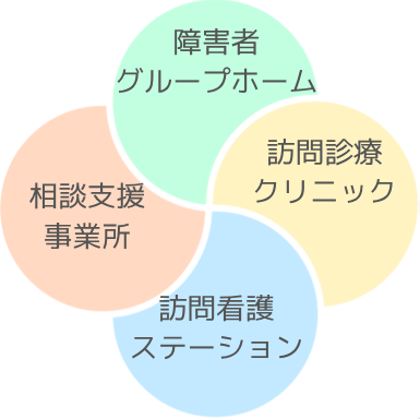 現在は、「グループホームあおいとり」「相談支援事業所つながる」「かたゆり訪問看護ステーション」「みかづき訪問診療クリニック(来年OPEN)」の4つの事業があります。