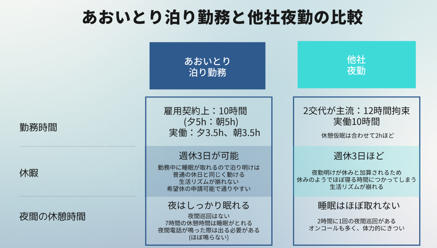 内定者: 泊り明けを「休日」として使えるのは、本当に大きいですね!夜間巡回がないのも、安心して休める大きな理由になりそうです。