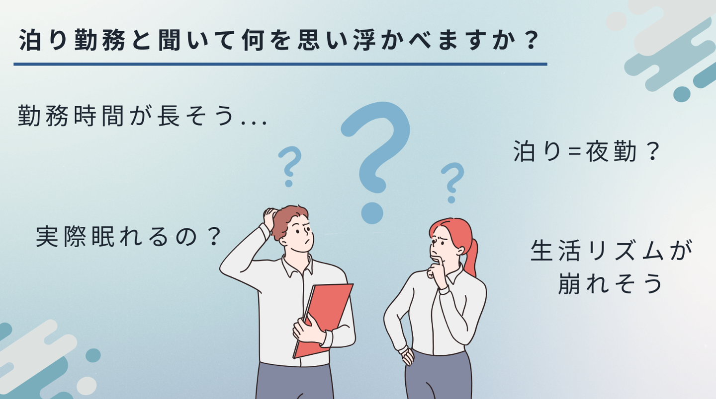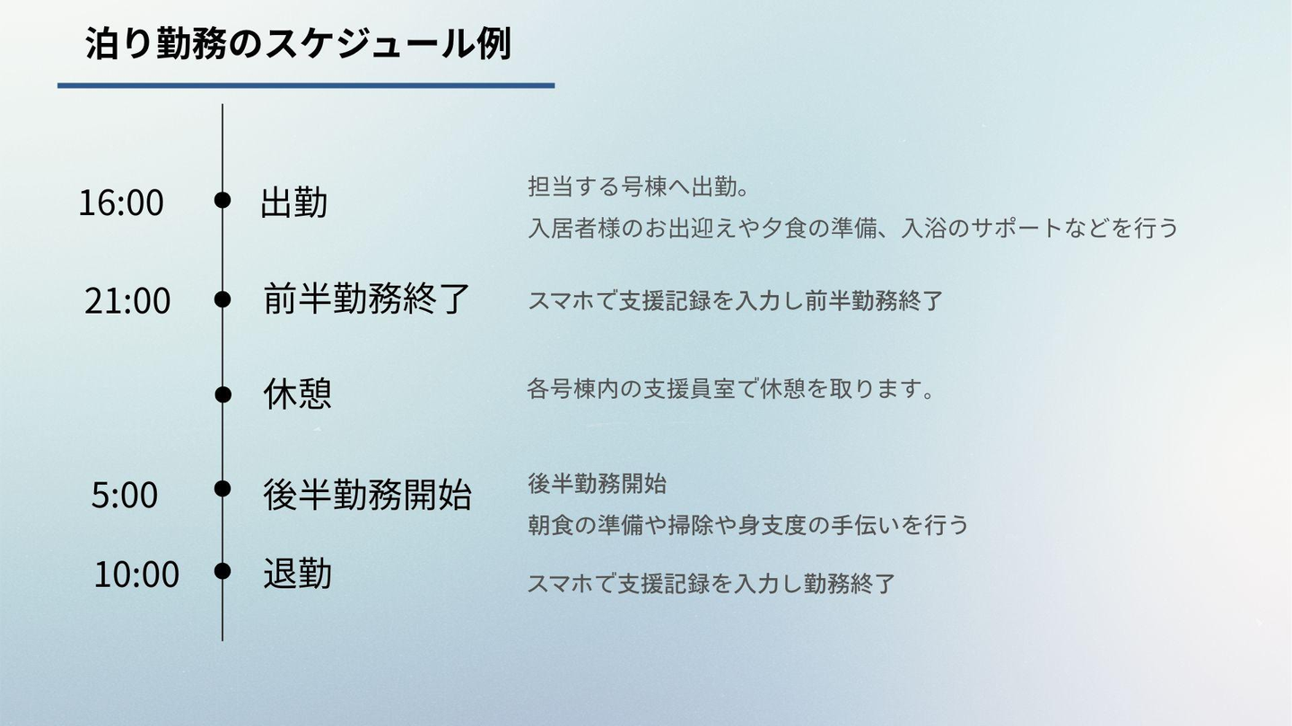 内定者: それでは、まず「泊り勤務」の具体的なスケジュールを教えていただけますか?