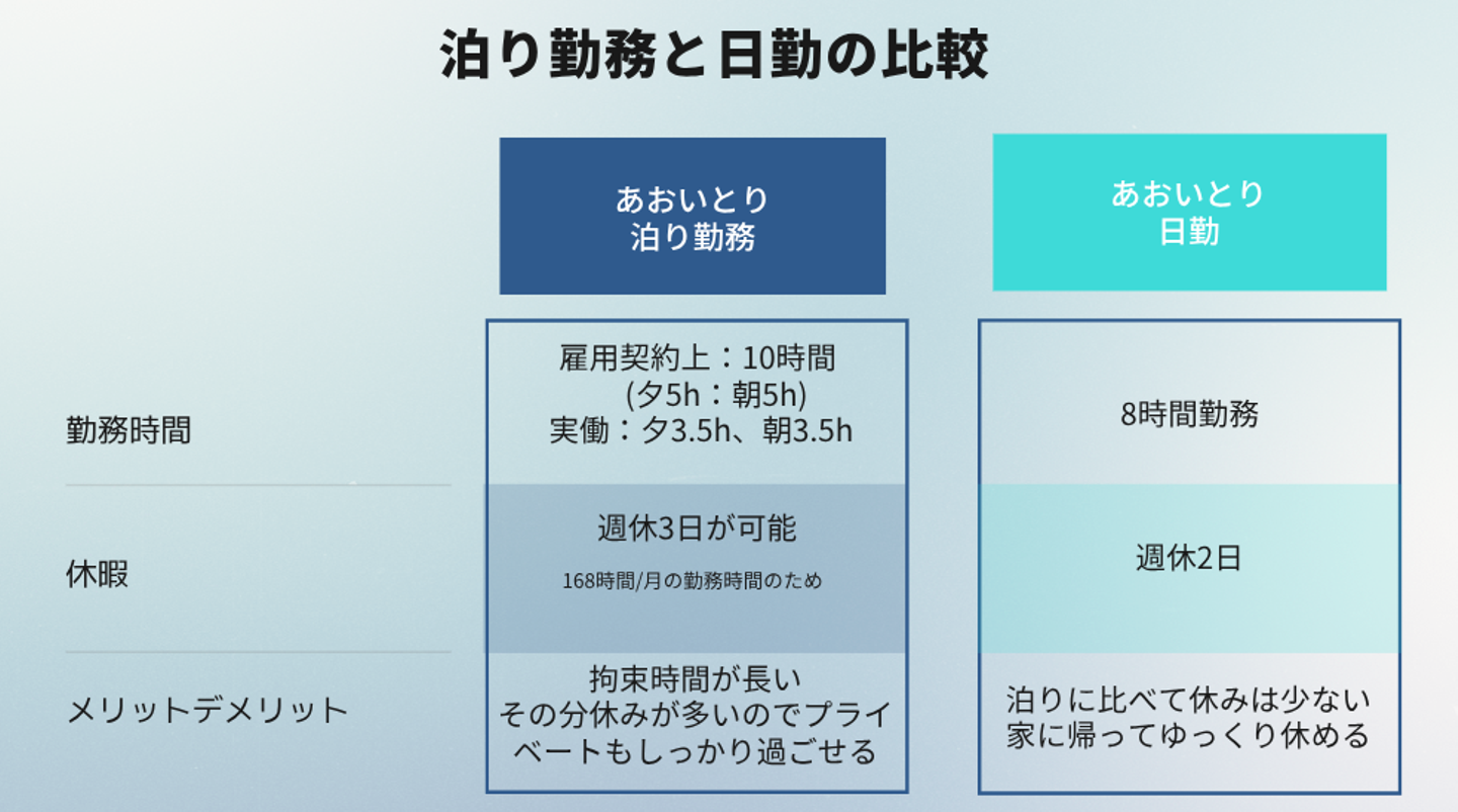 荻島: そしてあおいとりでは、月168時間勤務の規定があります。泊り勤務は1日の契約時間が10時間ですから、月に17日ほど働けば規定時間に達します。日勤に比べて少ない日数で月間規定時間をクリアできるため、結果的に週休3日になる週が頻繁に発生するんです。
