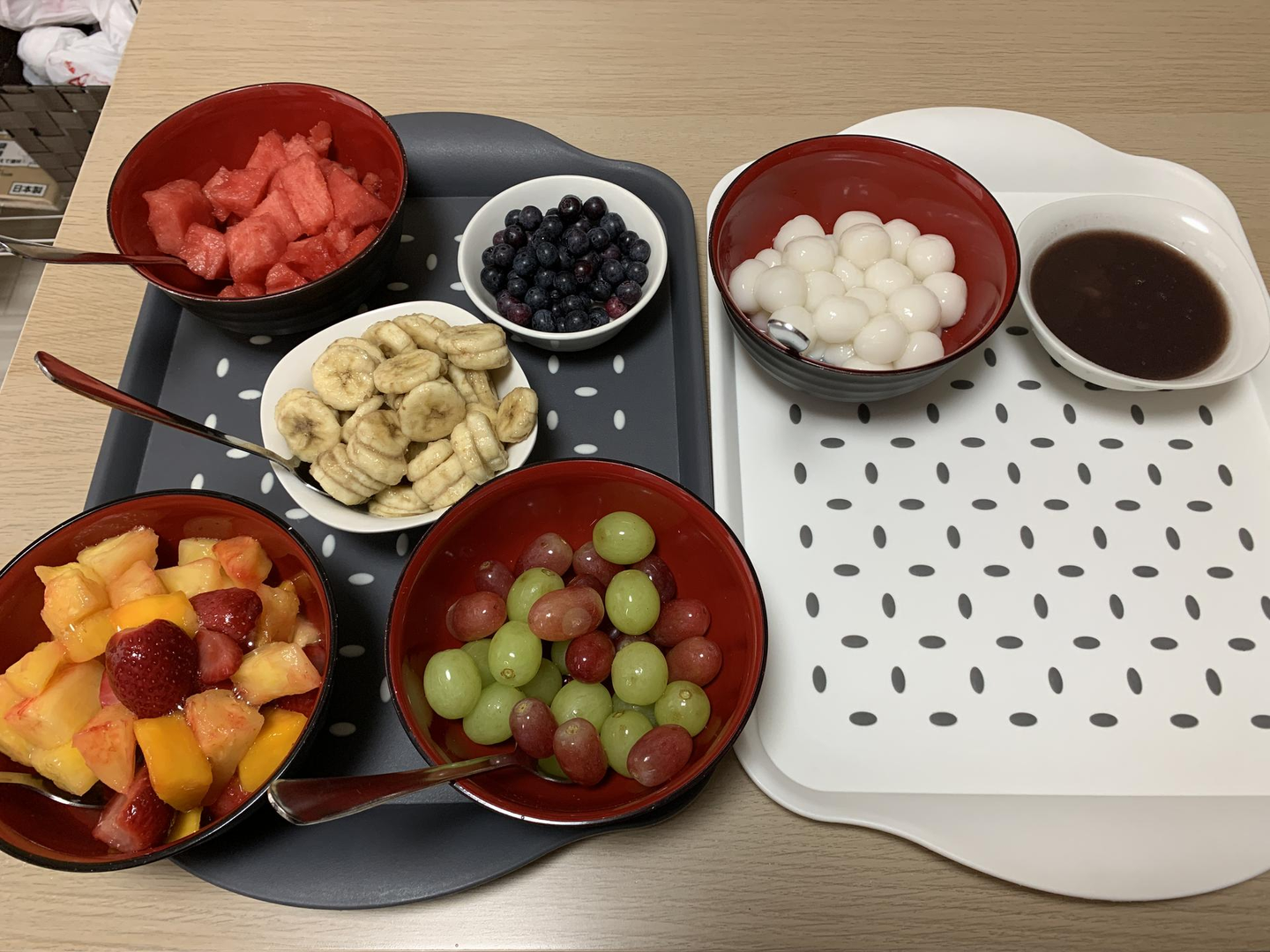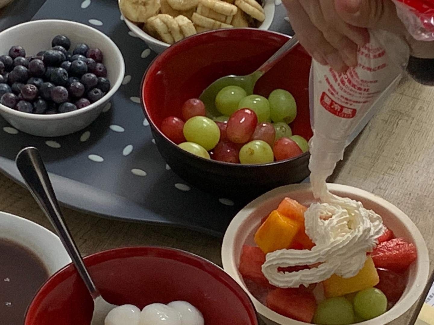 すいか、いちご、ブルーベリー(グループホームの裏庭で収穫しました!)といったフルーツの他に、白玉や生クリームなど、様々な具材を準備させていただいたところ、皆さん「どれにしようかな?」「これも美味しそう!」と、目を輝かせながらお好きなトッピングを選んでくださいました!