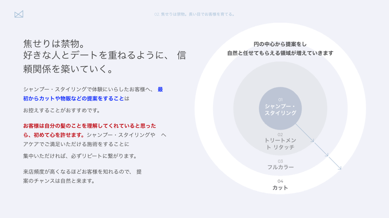初めてご来店されたお客様にいきなりカットを提案するのは、初めてのデートでホテルに誘うようなものです。本当に付き合いたいと思っている人に、1回目のデートでホテルに誘いますか?というと、妙に納得してもらえる。