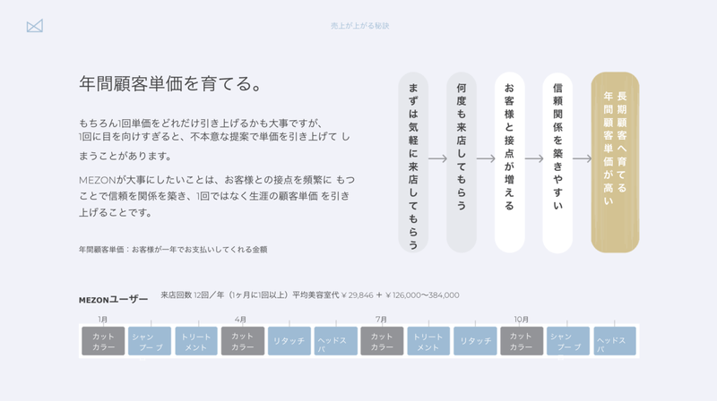 だからMEZONは、1回単価ではなく、年間顧客単価を育てることを推奨しているのだ。