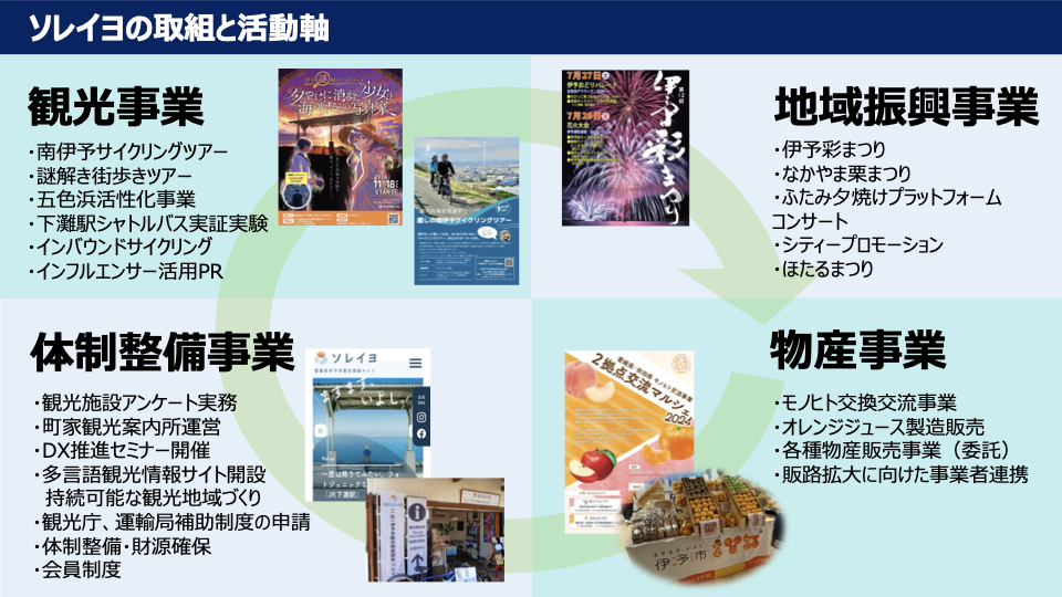 清水:ソレイヨは、伊予市に元々あった観光協会の後身として、観光業をさらに盛り上げるために、令和4年1月に設立、令和5年に登録DMOに認定されました。