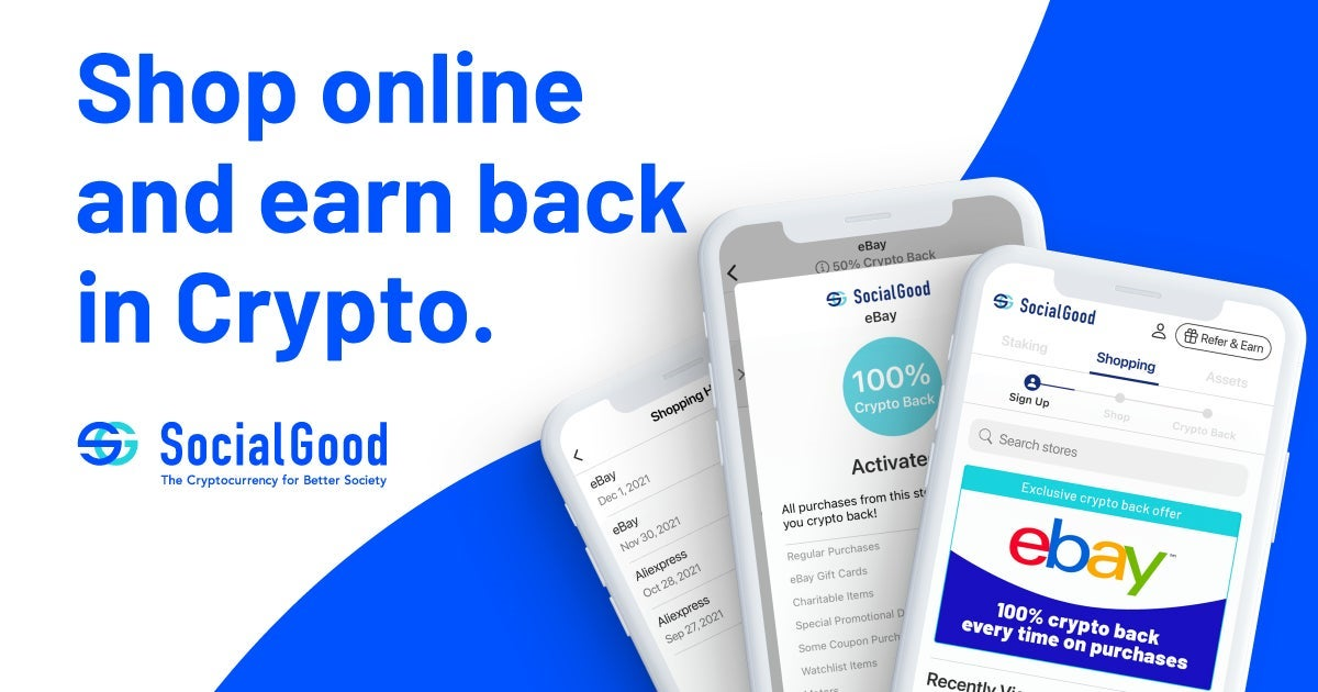 SocialGood App(iOS、Android)は『買物をすればするほど、資産が殖えるアプリ』です。eBay・Walmart等の提携ECサイトで買物をすると、購入金額の最大100%が仮想通貨SGで還元されます。既にSGは米国や欧州を拠点とする仮想通貨取引所に上場していることから資産性があり、ビットコインやUSDのステーブルコインに交換・換金ができます。SGには最大年利15%の利息(ステーキング・ボーナス*)もつきます。取得済の68個の特許により、この仕組みの新規性と革新性が裏付けられています。