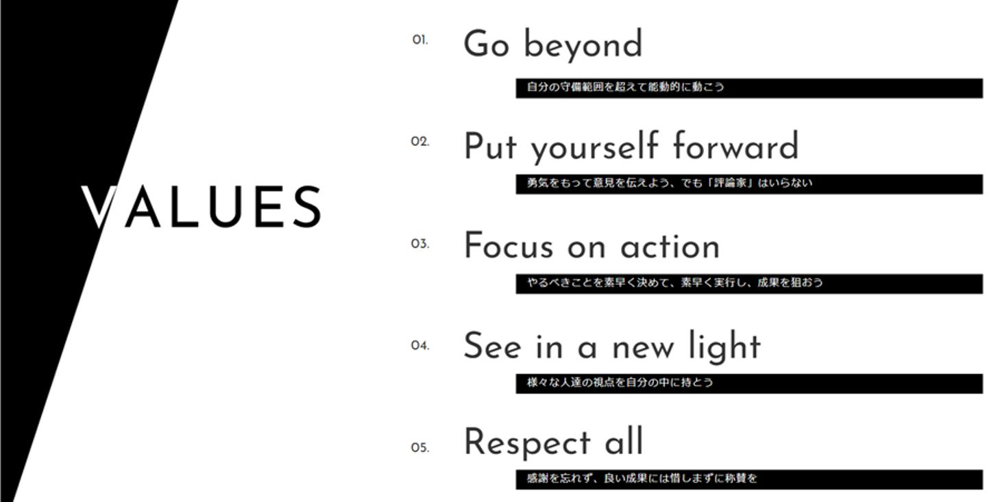 最後に、代表の濱口と話をし、企業バリューにもある「Go beyond(守備範囲の超越)」や「Focus on action(徹底的実行主義)」の考え方について聞き、バリューとして掲げるだけでなく実際に働いている方々が体現しているのを感じ、素直に凄く良いなと思ったんです。