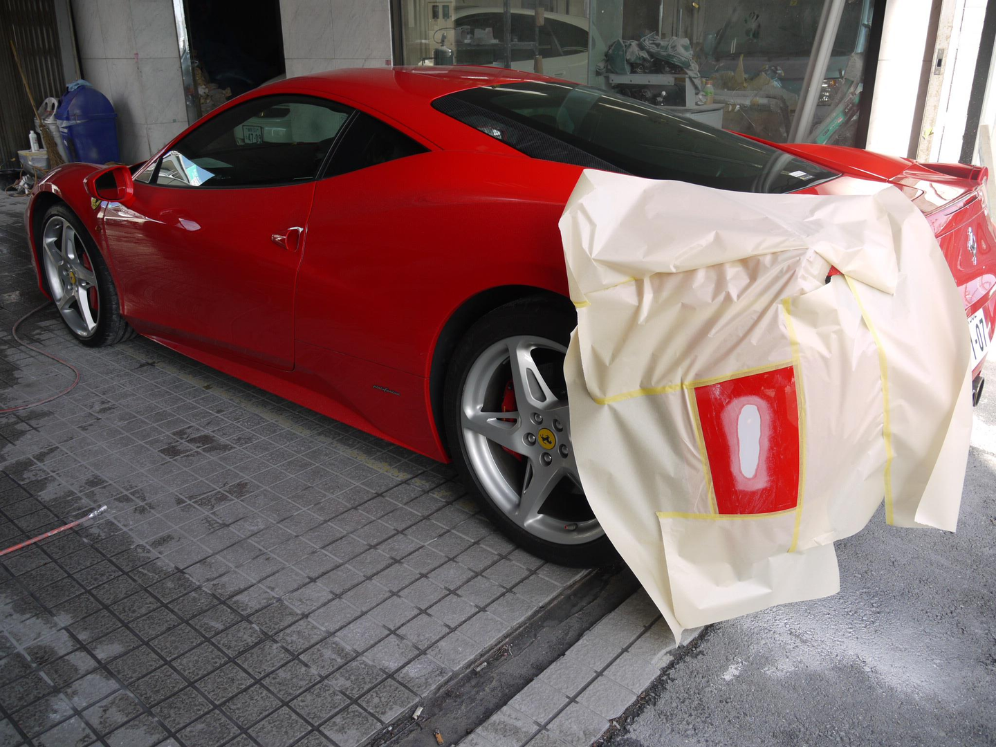 車のボディに、塗料を塗り、周囲の色合いと同調させ、