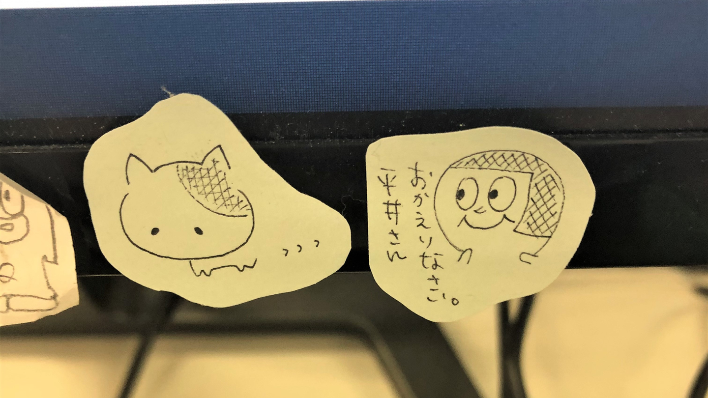 出勤初日。最初に目に飛び込んできたのは、私のデスクトップに貼られた小さな落書き。