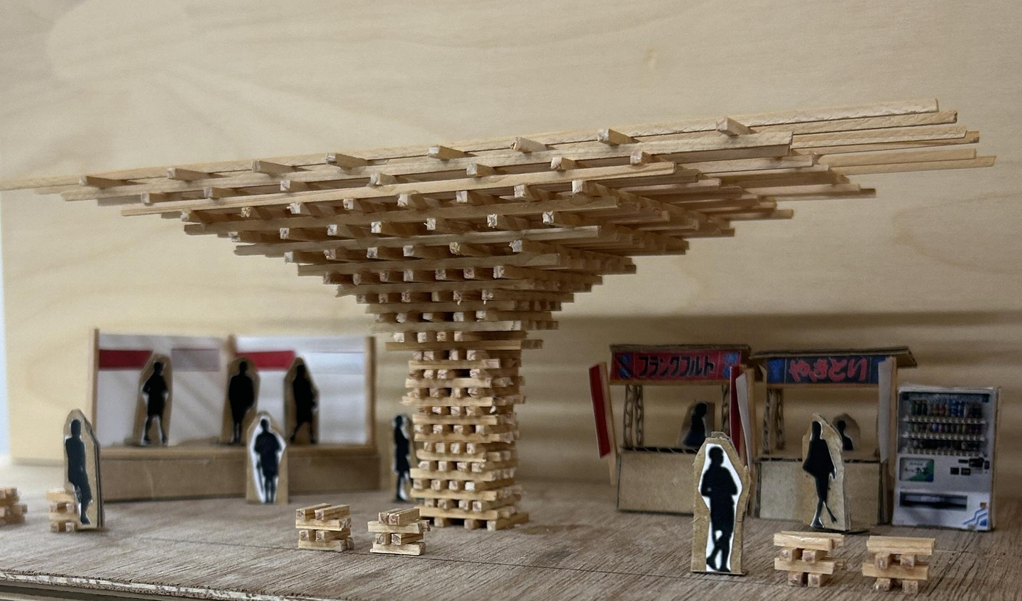 私は、敷地が都内であることから、人々の居場所を与える広場を検討しました。木材を使用することから、都内に大きな人口の木を設計しました。人々は木の下で過ごし癒しを与える。時にはイベントを行い人々の交流の場を生み出す。完成した模型が下の写真になります。