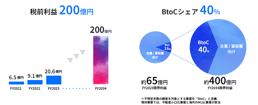 また、「富の循環を創出し、誰もが心に火を灯せる社会をつくる」というビジョンを実現するために、10年後の2034年に到達するべき定量的なビジョンとして、「税前利益200億円」「限界利益のBtoCシェア40%」を策定しました。