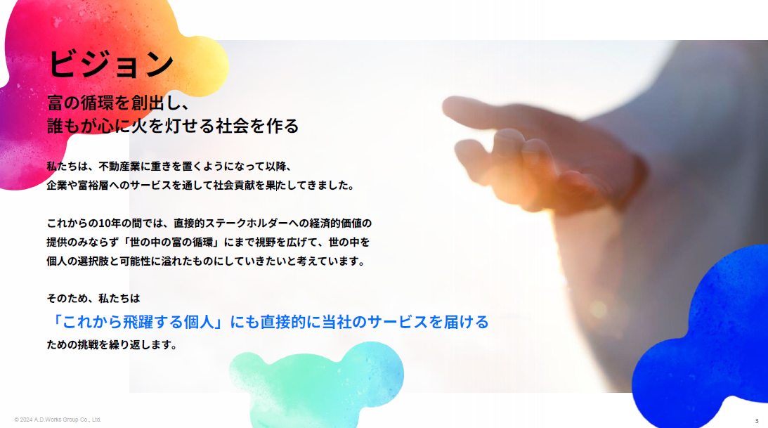 ADワークスグループではこれまで、富裕層や法人に向けたビジネスを中心に展開してきました。今後は裾野を広げて、「飛躍をしたい」「夢を叶えたい」という想いを持つ個人に対しても、商品・サービスを提供していきたいと考えています。さらに、経済的な要因で夢をあきらめている人たちに向けても価値を届けることで、誰もが可能性を追求することができる、“心に火を灯せる世の中”を作っていきたいと考えています。