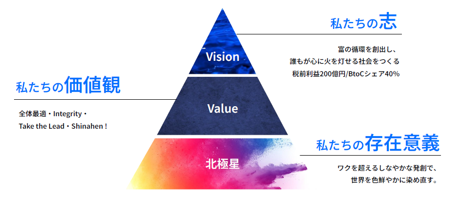 そして、北極星を前提に10年かけて達成したい世界として、「富の循環を創出し、誰もが心に火を灯せる社会をつくる」というビジョンを策定しました。定量的には、「税前利益200億円」「限界利益のBtoCシェア40%」を目指しています。