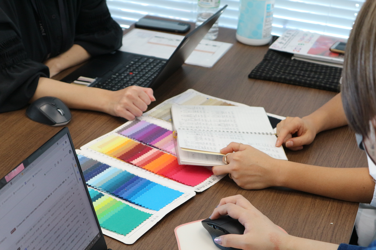 商品の検討会がある日です。出来上がったサンプルを部長に見せながら、値段や販売時期、仕入れ数などを伝え、商品化の承諾をもらいます。