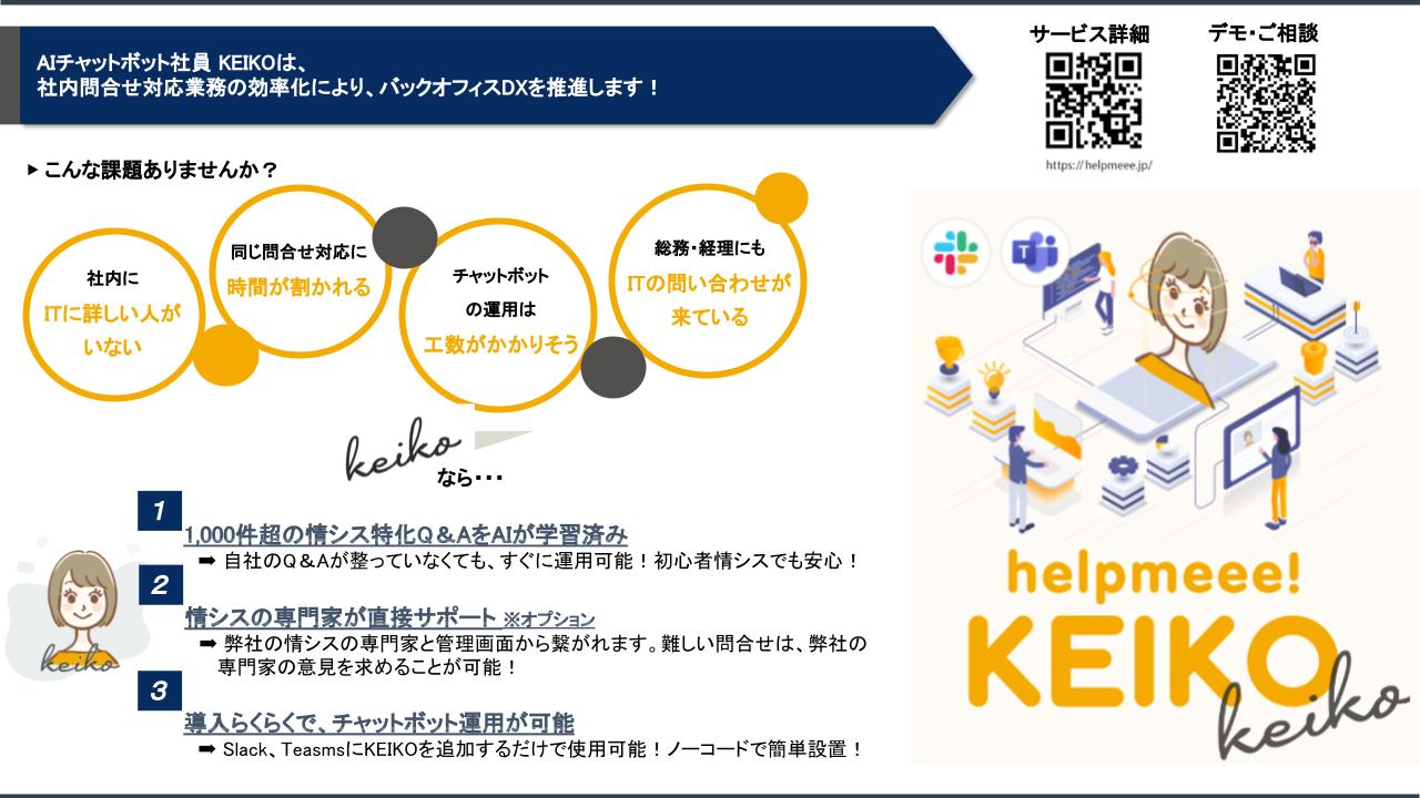 今回は、我々の登壇の様子と自社プロダクトのAIチャットボット社員『helpmeee!KEIKO』の様子を記事にしました!