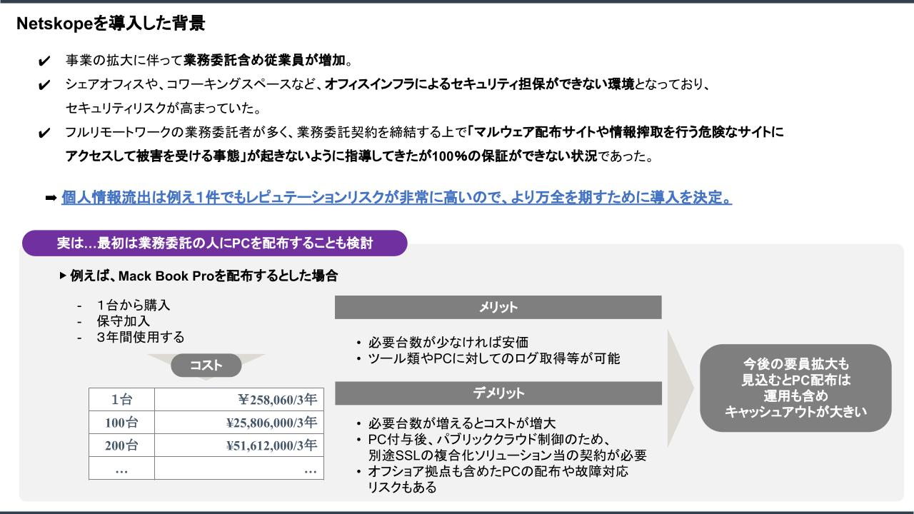 ユーザー会では当社がBYODを含めた中でどのように運用しているのか、とても興味を持って頂きました。確かに一番ベストなのは会社からPCを貸与するのがいいと思っています。しかし、前述の通りコストがとてもかかります。それを解決してくれたのが『Netskope』です!