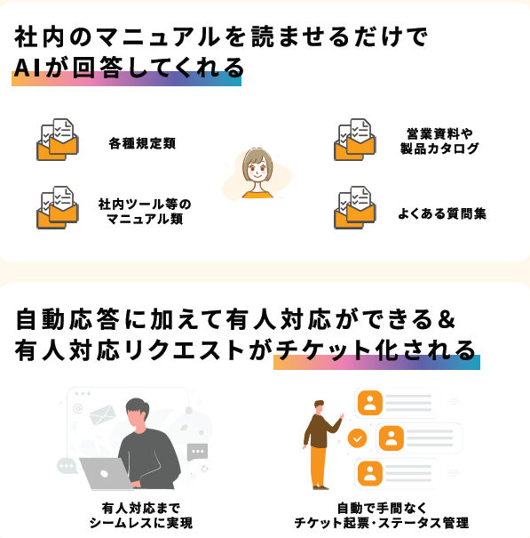 ◆社内のPDFやExcelをアップロードするだけでAIが学習して自動応答するRAGに対応