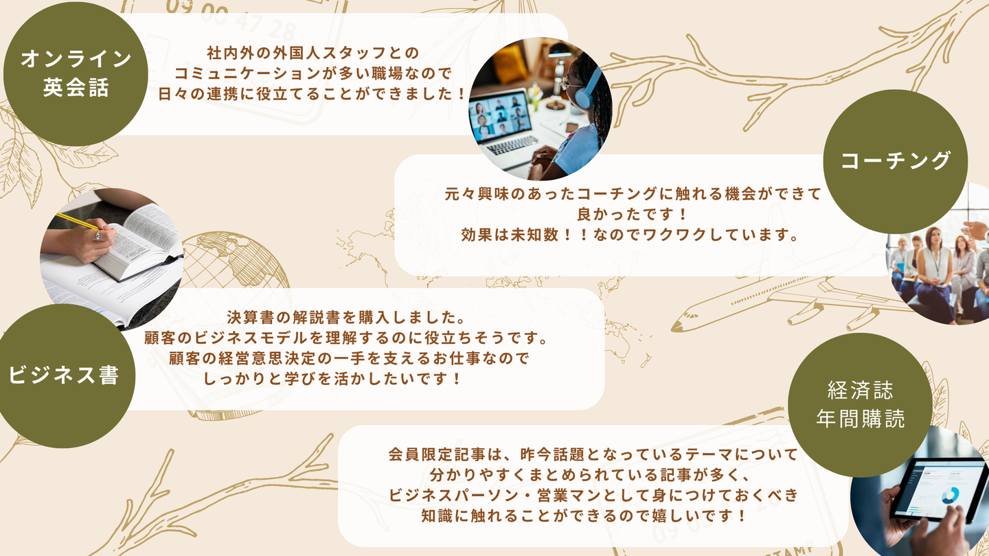 英語のオンラインコースを申し込んだり、ビジネス書籍の購入費用、または外部の
