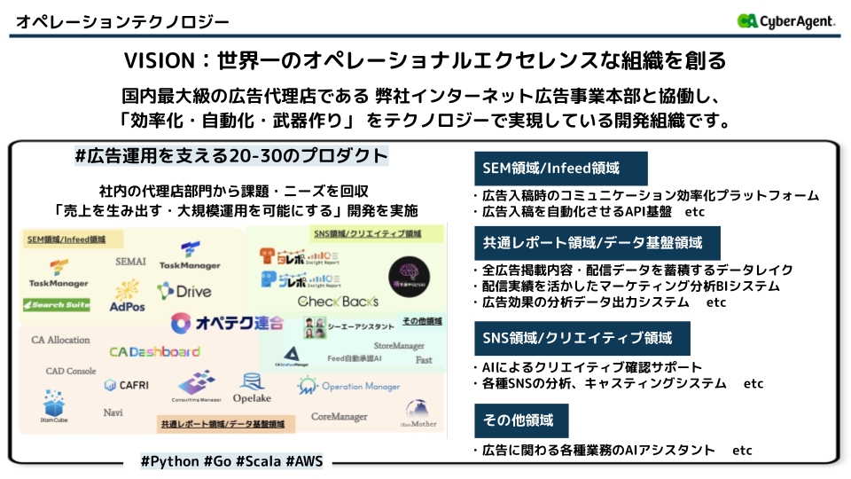 1998年の創業からサービスを提供しており、運用力やAI等の技術力を強みに顧客の広告効果最大化を追求し、インターネット広告のリーディングカンパニーとして市場を牽引しています。この広告事業の運用力を支える開発をしているのが、AI事業本部 オペレーションテクノロジーDivision(以下、オペテク)です。