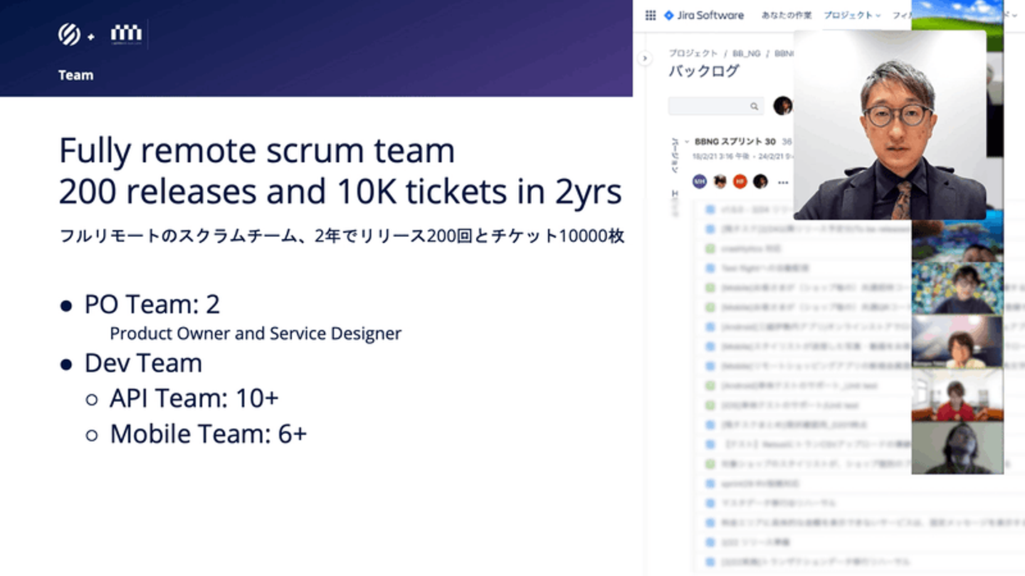 開発チームは全員がフルリモート環境で、スクラムで開発を行いました。プロダクトオーナー1名、サービスデザイナー1名、エンジニア約16名というチームです。アジャイルを採用したことで社内からは「なんだかよくわからないが、ものすごいスピードで改善されていく」という声もありました。