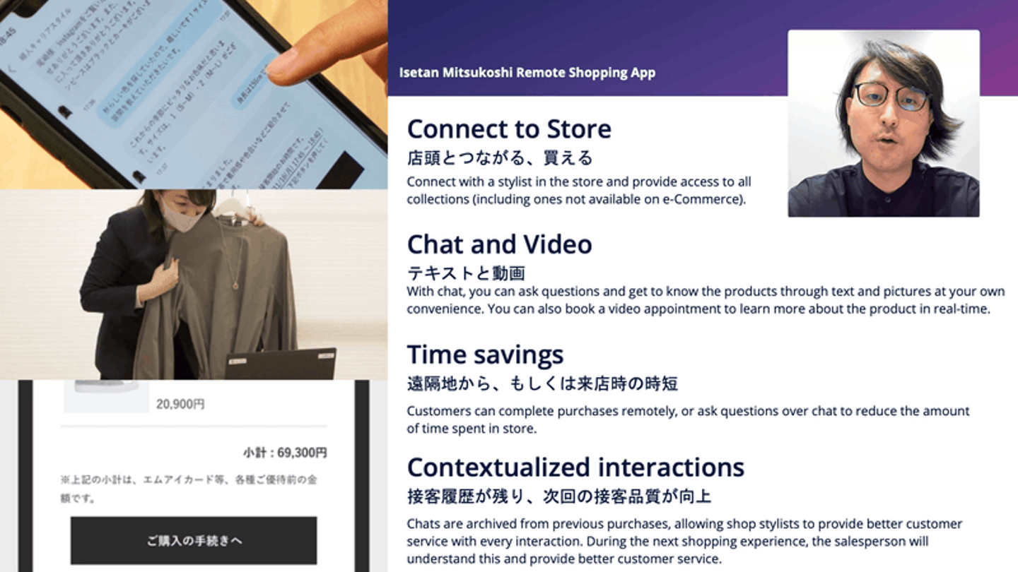 三越伊勢丹リモートショッピングは、どこからでもチャットやビデオ通話を通じて店頭の販売員による接客が受けられるサービスです。来店できない遠隔地のお客様だけではなく、平日にアプリで商品の候補を確認し、週末の来店を時短ですませる、という使い方をされるお客様も入らっしゃいます。また、接客の履歴をメモとして残すので、その後の接客品質の向上にもつながっています。