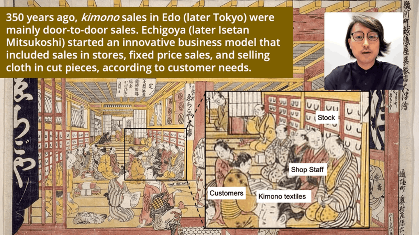 1673年、三越伊勢丹の前身である越後屋が創業。越後屋は「店前現銀無掛値(たなさきげんきんかけねなし)」というスローガンを掲げ、呉服の販売を訪問販売から店頭販売に切り替え、多くの一般市民を対象とした店頭での接客をはじめました。