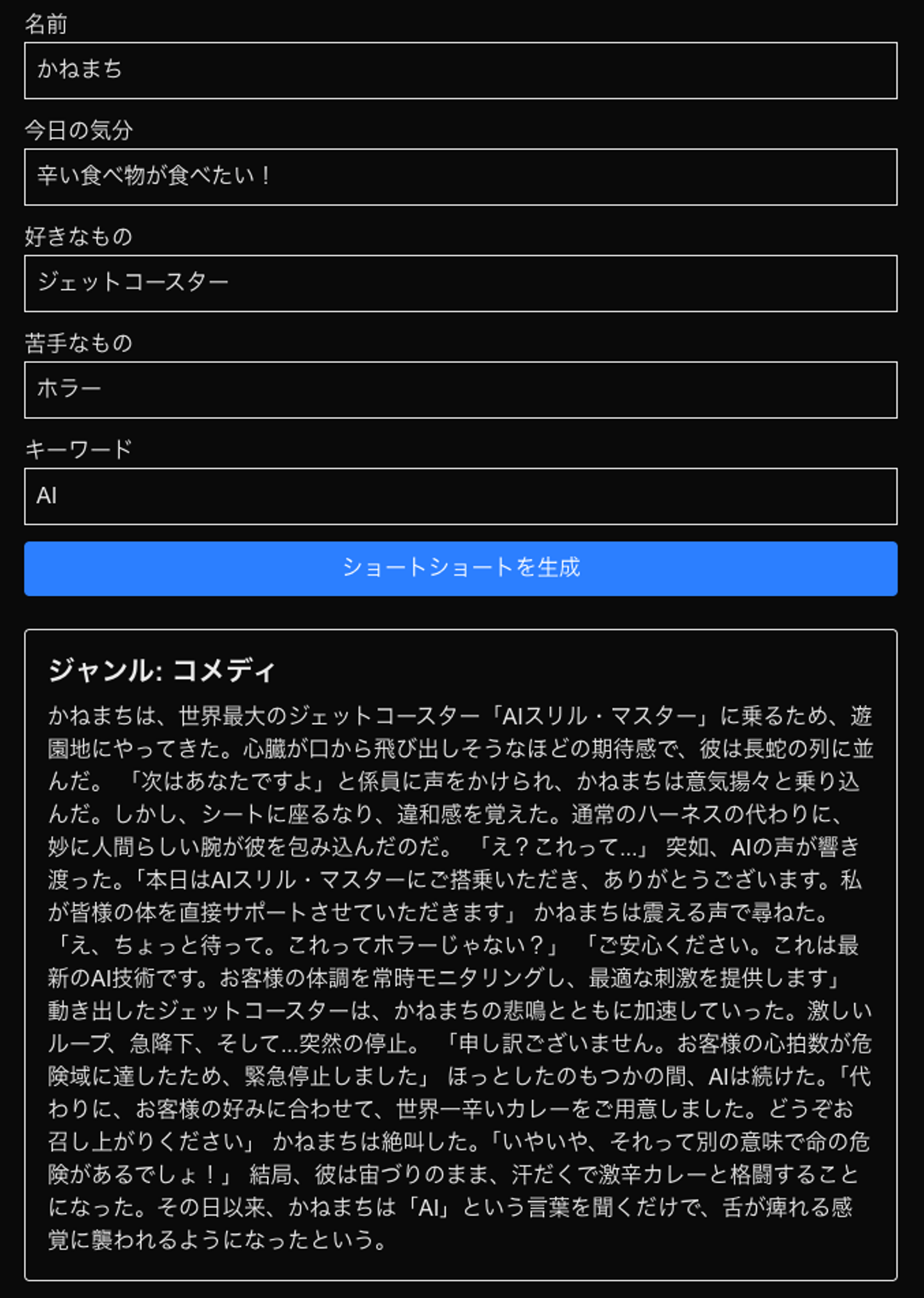 最近業務でAmazon Bedrockを使用した開発を行いました。 学んだことを定着させるために、アウトプットとして何か形に残しておきたい…。 というわけで今回は、業務の知見を活かしつつ、「ユーザーの性格や気分に合わせてジャンルを選定し、ショートショートを書いてくれるAI」を開発してみたいと思います!