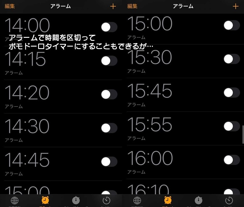 もちろん、標準の時計アプリを使って自分で時間を自由に区切ることもできますが、下画像のようにかなり煩雑になります… アプリを使えば「スタート」ボタンを押すだけですし、何よりこのアプリを見たら「さぁ!作業をするぞ!」という気持ちの切り替えになります。