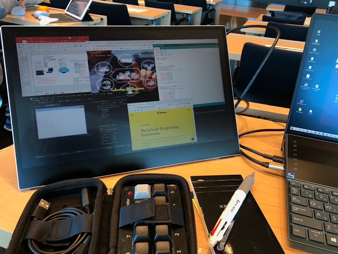 ② いろいろなワークスペースで作業をするとき、PCの画面が作業スペースの広さになるので、4Kの広さをケーブル一本(電源不要!)で確保できるのは癖になります。しかも最近は安くて軽い!
