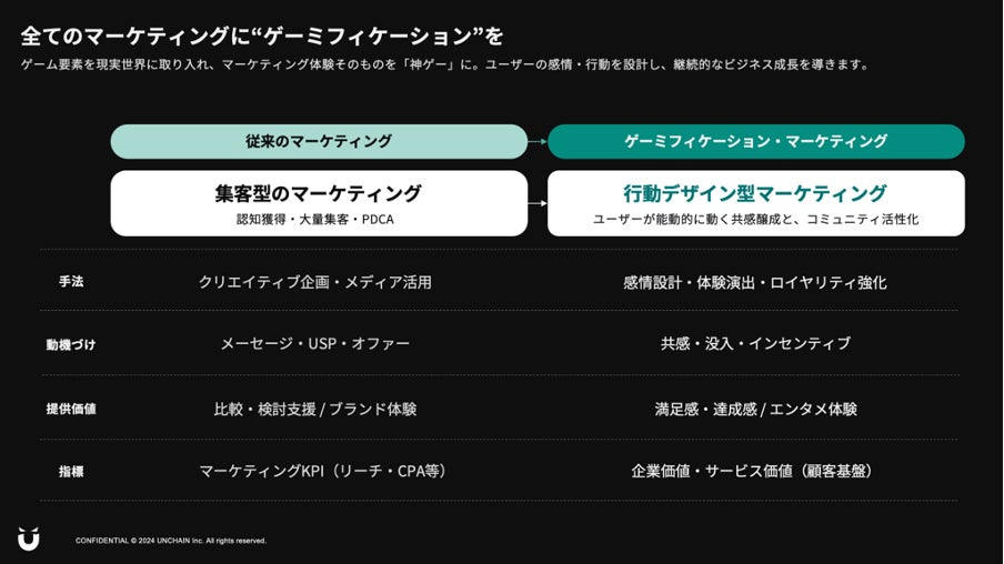 ユーザーがいつの間にかサービスに夢中になる仕組みを提供し、能動的に動かすことで従来のマスマーケティングではリーチさせることが難しいユーザーへのメッセージ到達や体験への参加を促します。