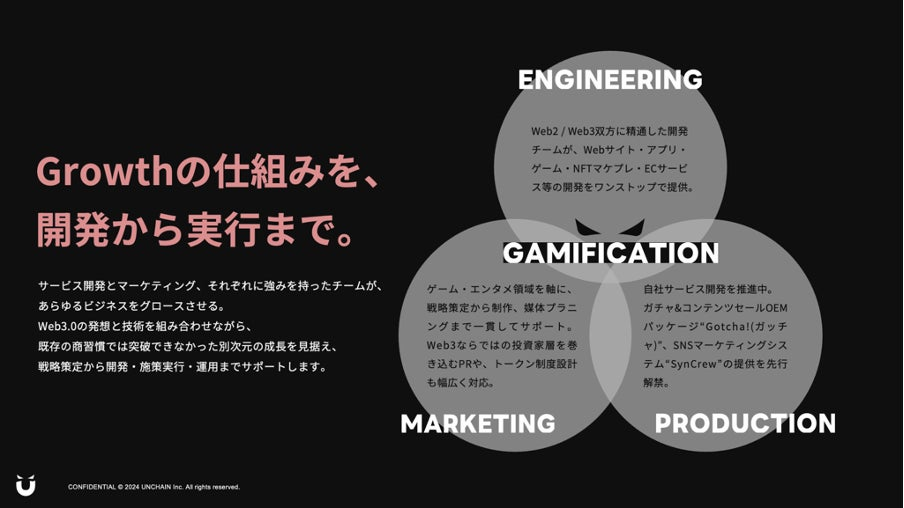 UNCHAINでは創業以来一貫して、ゲーム・エンターテイメントのサービス開発・運営・マーケティングを行って参りました。創業メンバーは、Web2 / Web3双方のゲームプロデュース・サービス開発を経験したメンバーや、マス・SNSマーケティングに精通したプロフェッショナルが集結。現在は、ゲームならではの「没入型の体験デザイン」をより汎用的に活用できるノウハウとして体系化し、幅広いビジネス領域における顧客戦略・マーケティングをご支援しております。