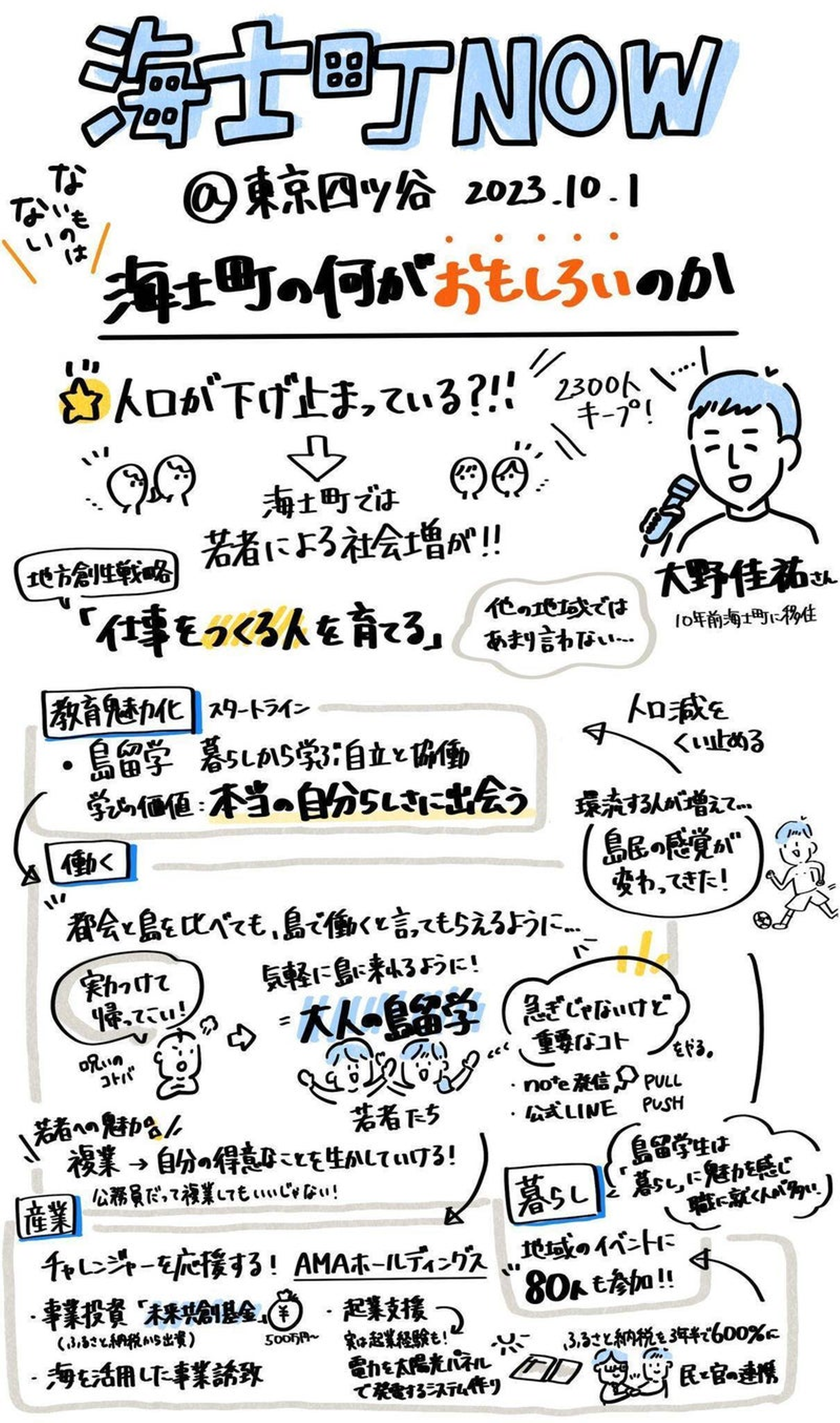こちらのグラレコは、イベントに遊びにきてくださった滝本さんがつくってくださいました!海士町でのインターシップ経験もあるとのことで大野さんのイラストもそっくりです!笑