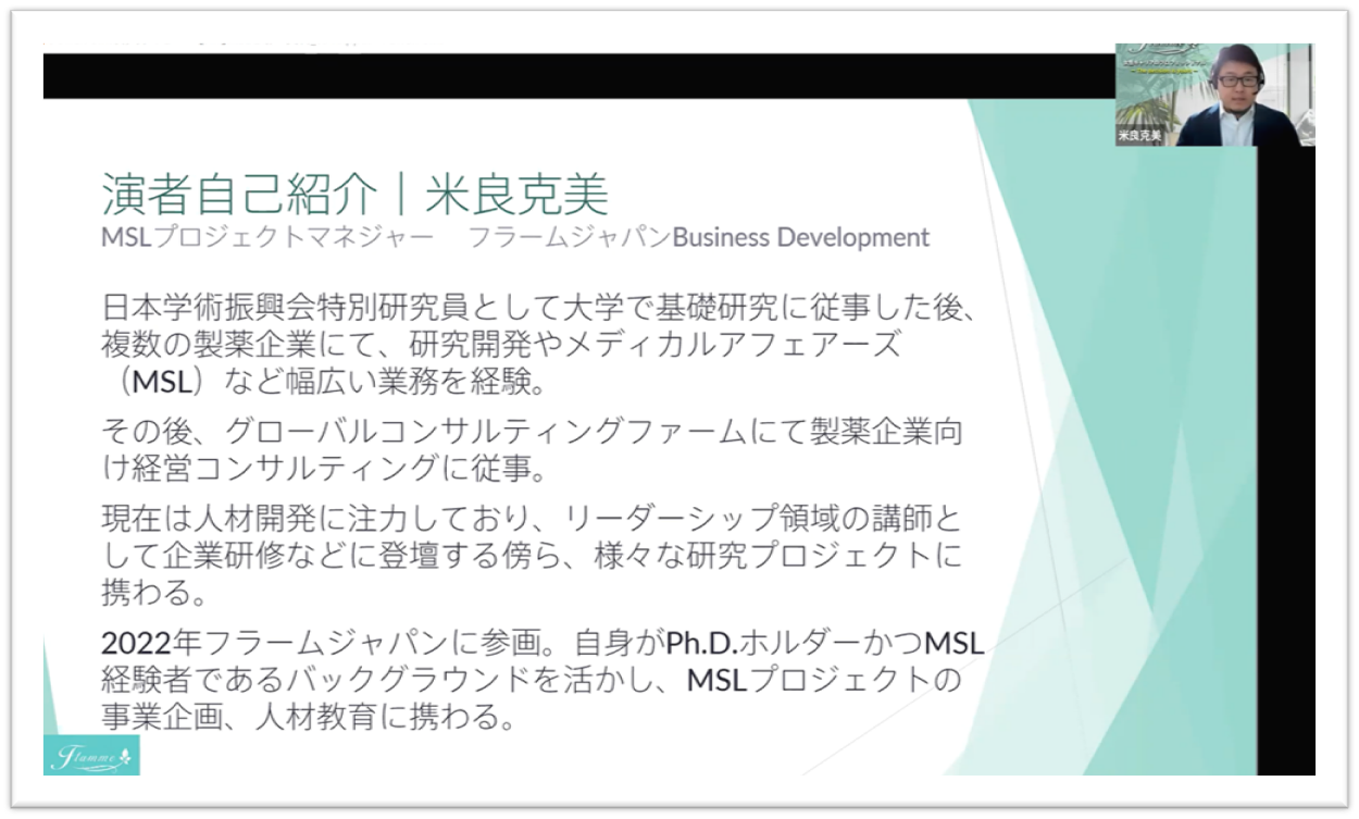 フラームジャパンは、先日「MSL採用・活用の最新トレンド~あるべき姿実現に向けての打ち手とは~」セミナーを主催し、Business Develpomentより岩永、MSLプロジェクトマネジャーの米良が登壇いたしました。