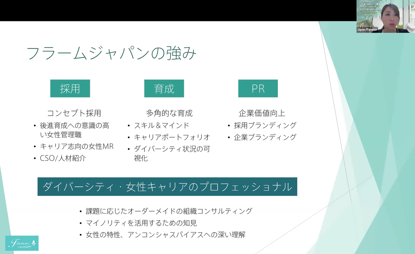 そこには一つの正解があるわけではありません。フラームジャパンでは、クライアント様毎にこれまでの企業の歴史や組織文化を踏まえながら、課題を分析し、ダイバーシティ・女性キャリアのプロフェッショナルとして最適なソリューションをご提供いたします。
