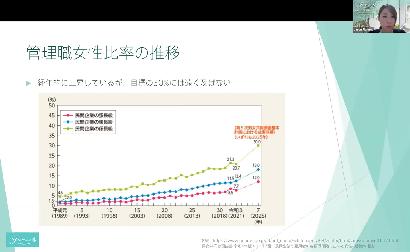 最初のセッションでは、女性管理職をめぐる現状について、日本、製薬業界の現状を整理しました。