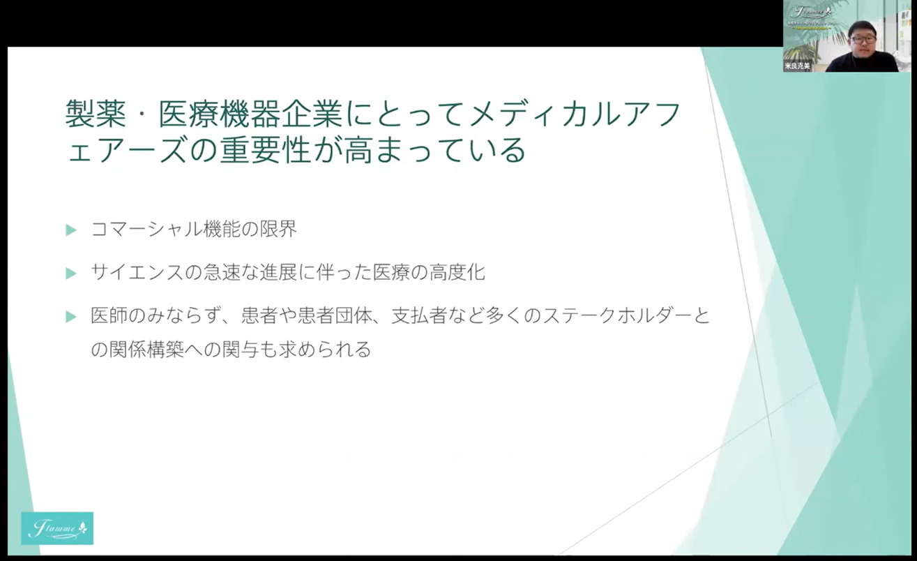 加えて、メディカルアフェアーズ、MSLの最新動向や、今後の展望をご紹介し、これからの時代に活躍するMSL像についてお話をさせていただきました。