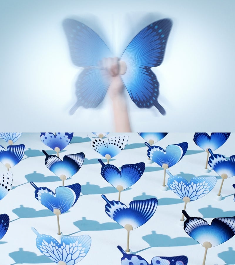 足立さんが企画・制作したTORAYの広告作品。“素材”が世界を変えることをButterfly Effectになぞらえ、植物由来の薄い布で作られたうちわを配布した