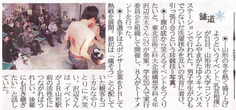 そうなんですよ。クリエイティブ業界でありがちな“やる気の搾取”ってすごく気持ち悪いと思っていて。皆が前向きに良いものを作るためには、ちゃんとお金を得てやるということは今もすごく意識しています。でもなんせその時のテーマは「乳首相撲」だったから、周囲の理解はなかなか得られず・・・。先生たちの卒論レビューが計4回あったんですが、「そんな企画やって欲しくない」「そもそも出来っこない」などの声を受け、反対され続けていました。でも僕はやめなかった。最終的には「ニップルファイト山形」というイベントを開催して1社1万円の協賛金も集めて、グッズも作りました。結果60人くらい集まって、イベントとしてなかなかの成功を収めましたね。それまで批判的だった周りの人たちも「本当に出来ちゃったんだ!」と驚いて褒めてくれました(笑)。