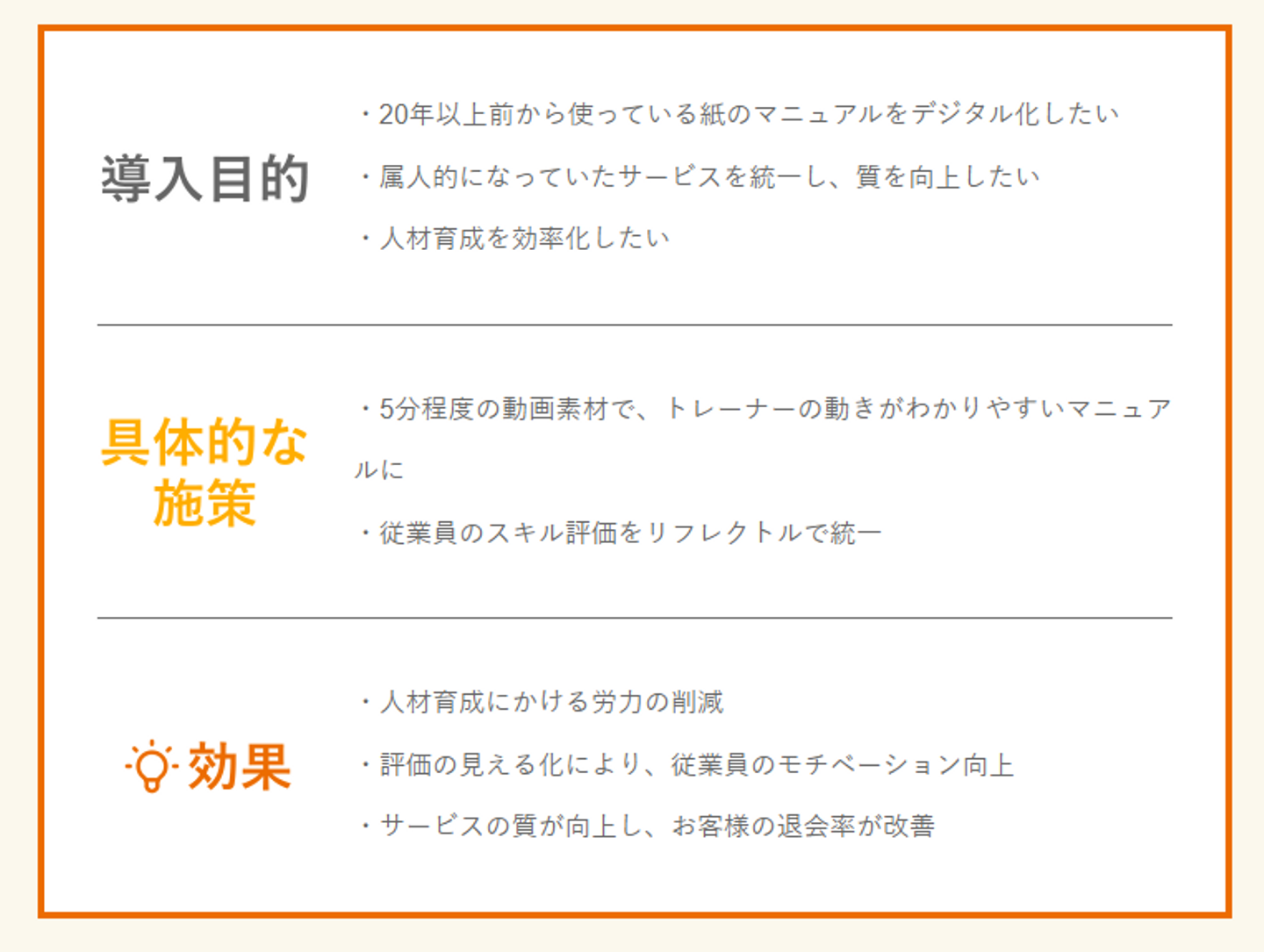 それぞれの会社に沿った形でリフレクトルを構築できる強みが出た良い事例です。カスタマーサクセスの伴走とその後の業務効率化や質の高い人材育成が可能になると力強いお言葉もいただいております。