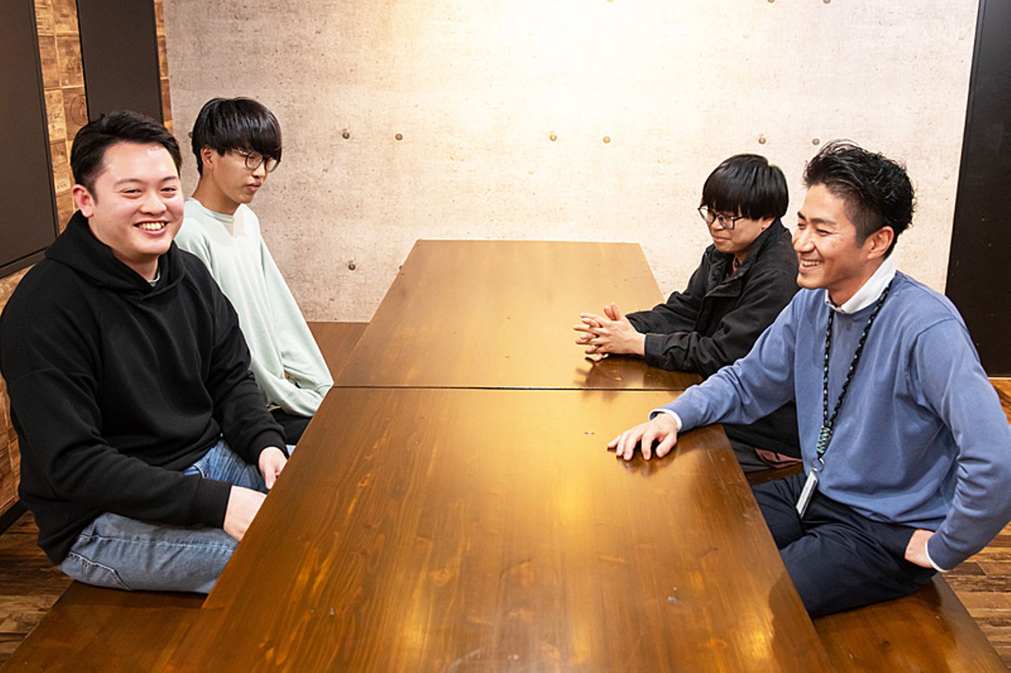 今回は、技術部長をはじめ、システムエンジニアの方、総勢4名に集まってもらい、会社の人間関係や働きやすい職場環境について楽しく語っていただきました。