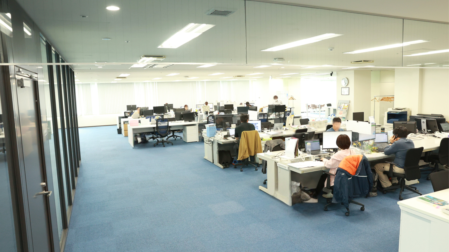 総勢約60名が働くこの本社オフィスでは、広々とした空間の中で6グループが集結しています。支店を含めると会社全体では130名ほどが働いており、約半数がこの本社に在籍しています。