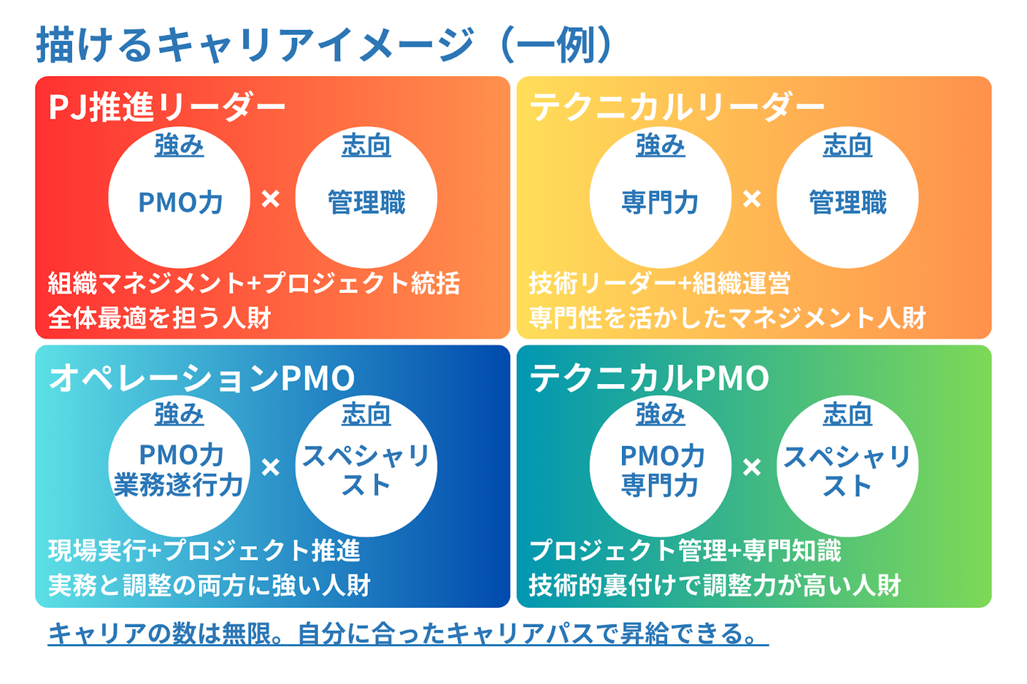 強みや専門領域が一人ひとり異なるという前提のもと、それぞれの強みを生かしながら、複数のキャリアパスを描けるようになっています。
